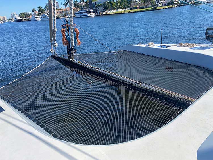 Longer durability than nets, sewed with Tenara / gore thread with SS grommets all around. See a SuperTramp installation in the Multihull Nets Image Gallery below.